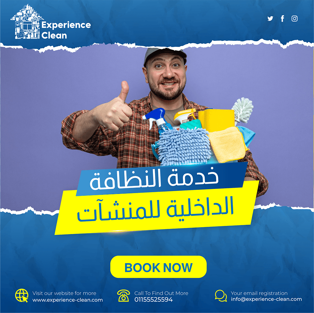 شركة experience من الشركات المتميزة في جمهورية مصر العربية للنظافة العامة والخاصة حيث نقدم خدماتنا لكل المشاريع على اختلاف أحجامها كما نقوم بتجهيز أفضل المواد الكيماوية اللازمة لأعمال النظافة والمطابقة لاشتراطات الصحة والسلامة العامة . كما نستخدم أفضل الآلات والمعدات الأكثر تطوراً للقيام بأعمال النظافة كما تقدم عمال نظافة يتمتعون بالمظهر اللائق والزي المتميز وأيضا نقوم بتدريبهم بصورة مستمرة للقيام بأعمالها تحت إشراف مشرفين متميزين يتمتعون بمستوى عالي من الخبرة ويعرفون جيداً إحتياجات ورغبات العملاء ويبذلون قصارى جهدهم بتنفيذ تلك الرغبات والإحتياجات.